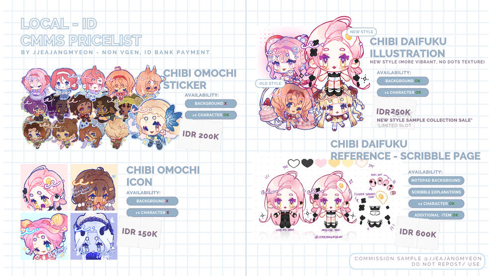 Commission type [(Style)(format)] : (Chibi Daifuku/ Chibi Omochi/ Jjeajangmyeon Style)(Illustration/ Skeb/ Icon/ Character Reference Sheet)